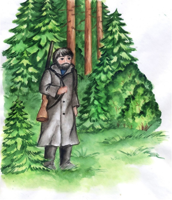 Так прошло несколько дней, пока однажды в лес не забрел охотник. Все лесные обитатели замерли в ожидании, пока случайный посетитель не покинет лес.