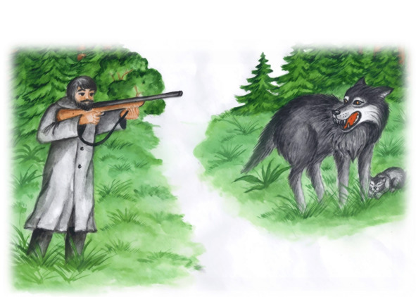 Охотник, шагая по лесу, проходил как раз мимо волчицы. Мать-волчица, встревоженная появлением незваного гостя, прижала волчонка к себе, чтобы тот своим писком не выдал их. Но малыш все-таки дал о себе знать, и взгляд незнакомца пал на волчицу. Охотник направил на нее ружье. Волчица поднялась, оскалилась, так как она переживала за малыша и хотела его защитить. Но незнакомец оказался очень жестоким и выстрелил.