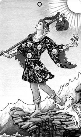 С образом коромысла перекликается та палка с узелком, которую держит за плечами нищий бродяга Шут на картинке Таро, балансируя на краю пропасти. В этом узелке – то «всё» и «ничего», которое заставило его отправиться в путь. Глаза безумца-Шута обращены к небу. Он не обращает внимания на бездну, разверзающуюся перед ним, на подстерегающего его хищного крокодила и на верного друга-собаку, что кусает его за ногу, пытаясь остановить. Следующий шаг может быть роковым – но раскрепощенная фигура Шута подчеркивает отсутствие всякого предначертания. Мы не знаем, как будут разворачиваться события: может, он свалится в пропасть, может, сделает шаг в сторону – а может, взлетит? Карта Шута воплощает свободу быть любым.