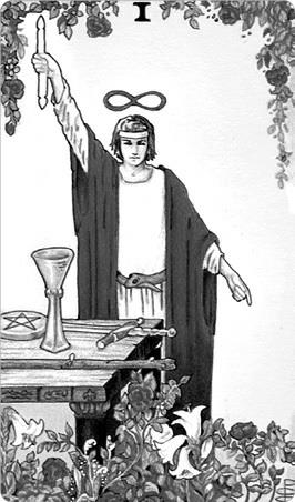 Алистер Кроули решил изобразить на карте Мага не просто палочку, а увитый двумя змеями жезл Гермеса. Это, несомненно, правильно и сразу указывает на то, что волшебное орудие Мага – принцип отражения бесконечного в бесконечном. Здесь уместно вспомнить, что исторически жезл Гермеса – знак вестника и парламентера. Маг может высказать, донести до нас весть, которую Шут лишь являет собой. Если Шут, не осознавая себя, отождествляется с Творцом, то карта Мага предполагает отчетливое видение себя, и видение необыденное, с позиции Высшего (Кетера). Неслучайно это первая по номеру карта Таро: любой путь начинается с самоосознания и самоопределения.