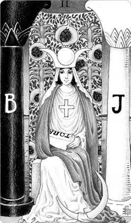 В первой триаде букв алеф являет волю творящего Бога-Отца, бет – совершенство Бога-Сына. Гимель, как совершенный исполнитель воли, предстает на карте Таро в пассивном женском облике, где акцент делается на восприимчивости к потоку и его непосредственной передаче. Отождествляясь с вечно изменчивым потоком, Жрица, в своей девственной чистоте хранящая связь с Высшим, символизирует бессмертное материнское начало, не дающее прерваться бесконечному потоку жизни. Элифас Леви соотносит этот аркан с зарождением жизни во всех трех мирах: в Брия, Йецира и Асия – или в мире прошлого, настоящего и будущего.