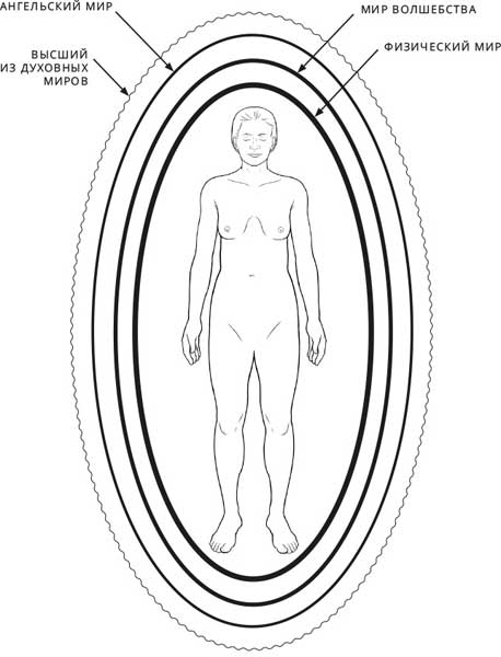 Царства, расположенные ближе к вам, являются самыми плотными и населены осязаемыми сущностями, например, реальными существами и людьми. Если вы пройдете через несколько слоев от центра, то столкнетесь с волшебными мирами. А если продвинетесь еще дальше, попадете на территории ангелов. И во всех царствах есть и темные/манипулятивные, и светлые/божественные сущности, но с ними можно взаимодействовать при помощи воображения. Они могут манить нас, увлекая вперед, и посещать нас, предлагая наставничество, влияя на нас, исцеляя энергией и другое. На рис. 4 вы увидите, что я имею в виду.