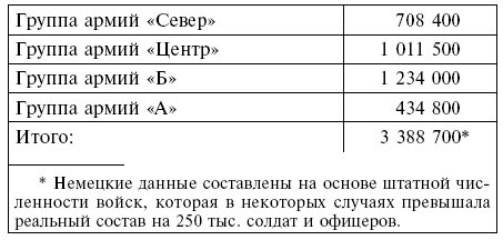 В армии были вновь сформированы танковые корпуса, а также, по примеру немцев, танковые армии. В численности войск Советский Союз имел преимущество. По данным немецкой стороны, по состоянию на 20 сентября Советский Союз имел в составе своих вооруженных сил на германском фронте 4 255 840 солдат и офицеров, в том числе 3 013 370 человек на переднем крае и 1 242 470 в резерве. Немецкие группы армий «Север» и «Центр» имели перед своим фронтом превосходящего их численно противника, а с учетом имевшихся в Красной армии резервов можно было с полной уверенностью заявлять о количественном перевесе советской стороны на всех участках фронта (у немцев и их союзников также имелись резервы. – Ред.). Сравнительные данные по количественному составу сил сторон, по данным отдела «Иностранные армии Востока», представлены в следующих таблицах: