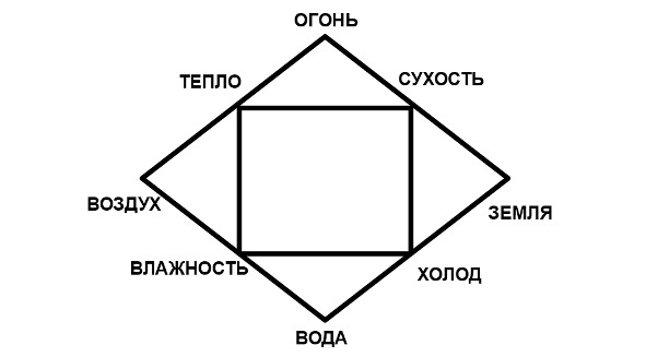 Вода и воздух, однако, сочетались друг с другом или обладали сродством друг к другу. Таким образом, Вселенная состояла из четырех основных элементов, связанных с четырьмя первичными качествами и обладавшими парными свойствами сродства и противоположности (Рис. 1.1.).