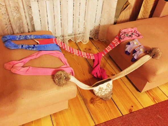 «С помощью растянутых шарфа и шапки автор явно хотел показать, соединение прошлого и будущего в настоящем моменте. Морда кота – это единство с природой, а повернутые в одну сторону носки – поиски душевного покоя. Что означают розовые и синие колготки, даже для экспертов культуры осталось загадкой».