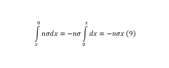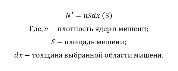 Определим количество ядер в этом отрезке двух координат – x и x+dx, если толщина между ними dx. Для этого введём значение плотности ядер, которое определяет количество ядер вещества в единице объёма, она определяется как отношение плотности вещества на его атомную массу в кг и изменяется в ядро/м3 (2).