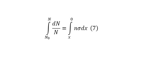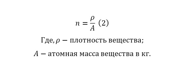 Let’s determine the number of cores in this segment of two coordinates – x and x+dx, if the thickness between them is dx. To do this, we introduce the value of the density of nuclei, which determines the number of nuclei of a substance per unit volume, it is defined as the ratio of the density of a substance to its atomic mass in kg and changes into a nucleus / m3 (2).