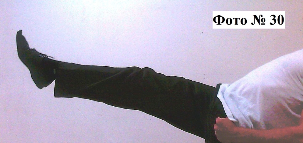 2). Контратакующий удар всей стопой или пяткой, наносится в корпус атакующего вас противника. Совершается быстрым подъёмом согнутой в колене ноги с последующим резким отталкивающим движением Фото № 31.