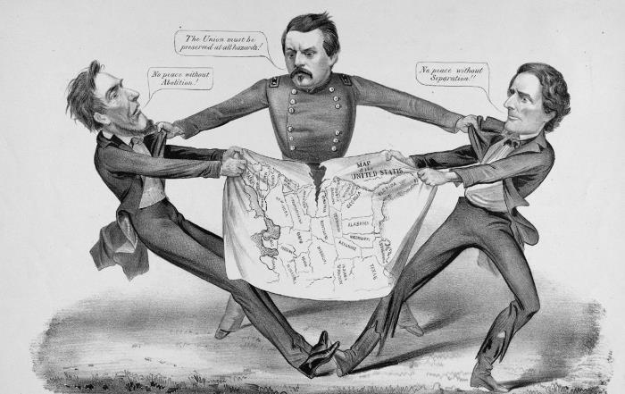(«Никакого мира без отмены рабства!») и Джефферсон Дэвис, президент Конфедерации южных штатов («Никакого мира без разделения!») разрывают карту США /«Метрополитен-музей»