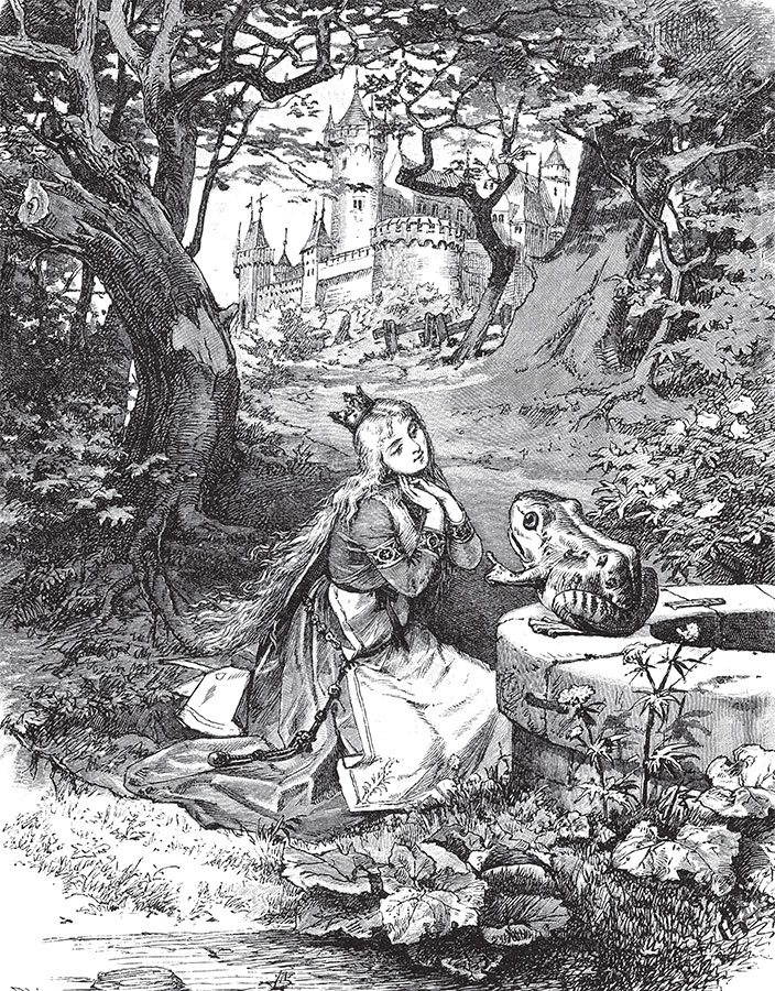 Но вот случилось однажды, что подброшенный королевной золотой мяч попал не в ее протянутые ручки, а пролетел мимо, ударился оземь и прямо покатился в воду. Королевна следила за ним глазами, но, увы, мячик исчез в колодце! А колодец был так глубок, так глубок, что и дна не было видно. Стала тут королевна плакать, плакала-рыдала все громче да горестней и никак не могла утешиться. Плачет она, заливается, как вдруг слышит чей-то голос: «Да что с тобой, королевна?! От твоих слез и в камне жалость явится!..» Оглянулась она, чтоб узнать, откуда голос звучит, и увидела лягушку, которая высунула свою толстую, уродливую голову из воды. «Ах, так это ты, старый водошлёп! – сказала девушка. – Плачу я о своем золотом мячике, что в колодец упал!..» – «Успокойся, не плачь! – отвечала лягушка. – У меня-то средство найдется, чтоб горю твоему помочь; но что дашь ты мне, если я тебе игрушку достану?» – «Да все, что хочешь, милая лягушечка! – отвечала королевна. – Мои платья, жемчуг мой, каменья самоцветные, а еще в придачу и корону золотую, которую ношу!» И отвечала лягушка: «Не нужно мне ни платьев твоих, ни жемчуга, ни камней самоцветных, ни твоей короны золотой; а вот если бы ты меня полюбила, и стала бы я везде тебя сопровождать, разделять твои игры, за твоим столиком сидеть с тобой рядом, кушать из твоей золотой тарелочки, пить из твоей стопочки, спать в твоей постельке; если ты мне все это обещаешь, я готова спуститься в колодец и достать тебе оттуда золотой мячик!» – «Ну да, – отвечала королевна, – обещаю тебе все, чего хочешь, лишь бы ты мне только мячик мой вернула!» Она-то думала: «Пустое городит глупая лягушка! Сидеть ей в воде с подобными себе да квакать, а где уж ей быть человеку товарищем!»