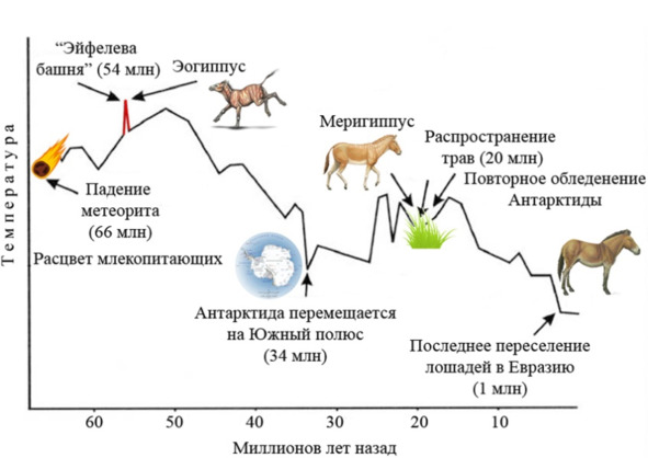 65 млн. лет назад на Землю упал метеорит, поставивший точку в существовании динозавров, что способствовало расцвету млекопитающих. Он же стал причиной одного из самых резких скачков температуры за всю историю нашей планеты, так называемой «Эйфелевой башни», повлекший за собой смену многих видов. Термическая аномалия вызвала резкое увеличение объема осадков, лето стало более жарким, а наводнения интенсивными. В это время в районе Северного полюса росли пальмы и по всему Земному шару распространились виды планктона, характерные для тропиков. Повышение температуры происходило очень быстро, всего лишь в течение 10—20 тысяч лет, а возвращение к прежнему состоянию заняло несколько сотен тысяч лет. По завершению этого прекрасного периода, освободившего жизненные ниши для новых видов, в позднем палеоцене – среднем эоцене, около 55—45 млн. лет назад, в Северной Америке, возник самый ранний из предков лошадей, житель тропических и субтропических болотистых лесов – фенакодус или, как его раньше называли, триспондил. Длина тела его достигала 1,5 метра, а весил он около 55 кг. Скорее всего, он был травоядным (хотя не все ученые в этом уверены), бегал на пятипалых длинных прямых ногах, а его ногти стремились превратиться в копыта.