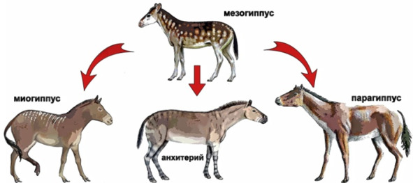 Изменение климата привело к эоценово-олигоценовому вымиранию видов, и резкой смене видового состава в Европе. А в Америке в это время продолжилась редукция пальцев конечностей и усложнение зубного аппарата копытных, вследствие чего и возник мезогиппус (38 – 26 млн. лет назад). Он был размером с небольшую овчарку, и позже разделился на миогиппуса, анхитерия и парагиппуса, давших большое разнообразие форм. Миогиппус и анхитерий жили в лесах, питаясь мягкой растительностью, хотя усложнение зубного аппарата говорит нам о некоторой смене кормовой базы, и сохраняли сильно развитые боковые пальцы, которые все еще могли раздвигаться, служа опорой на мягкой лесной почве. Но хвост у них стал короче, а конечности более длинными, ради более быстрого бега ради спасения от все совершенствующихся хищников. Часть потомков миогиппуса перебралась в Азию, просуществовав там несколько миллионов лет, а анхитерий и его ближайшие родственники, оставшись в Америке, примерно в тоже самое время, исчезли без следа.