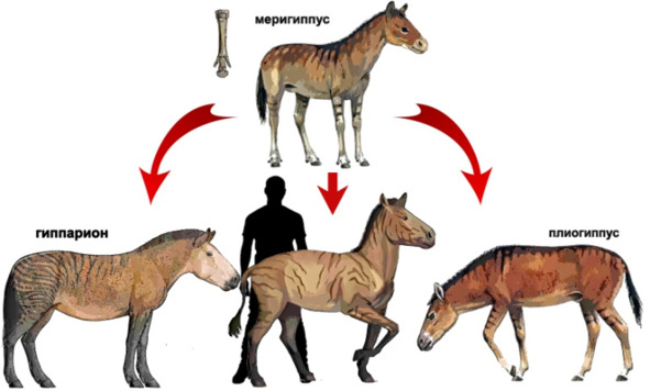 В раннем миоцене, 20 млн. лет назад, после того как Африка столкнулась с Евразией, а Индия с Азией, вызвав поднятие Тибета, произошли очередные глобальные перемены в климате. Эти изменения повлекли за собой изменения в растительности, которая стала поглощать больше CO2, чтобы сэкономить воду. Тропические леса в Европе и Америке отодвинулись из средней полосы в сторону экватора, их место заняли хвойные и смешанные леса, а к югу от этих них образовались, увеличивающиеся в размерах, жаркие саванны и сухие степи. Именно в них цветковые и зерновые, огнестойкие, волокнистые травы нового типа стали распространяться невероятно широко, захватывая огромные пространства. Самыми подготовленными к этим изменениям оказались будущие непарнокопытные. Это было начало их расцвета, поскольку их зубы, уже привыкшие к сухим травам степей, подходили для таких растений как нельзя лучше. Расширение равнин позволило меригиппусам дать много разнообразных ветвей. Причем, у разных видов процесс укорочения боковых пальцев шел по-разному: у одних они стали длиннее, у других – короче. Некоторые из меригиппусов дали разнообразные тупиковые ветки, плиогиппусов и многочисленных гиппарионов. Несмотря на то, что сами гиппарионы не являются прямыми предками современных лошадей, они довольно неплохо изучены, и на их примере мы рассмотрим более продвинутый вариант меригиппусов.