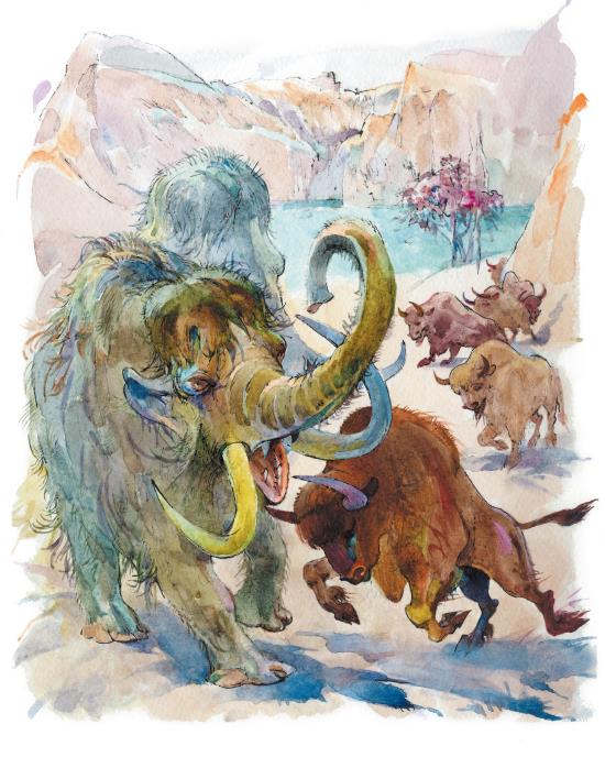 Рёв побеждённого потонул в поднявшемся крике. Семь зубров и пять мамонтов ринулись друг на друга в лютой жажде крови, ослепившей их и заставившей потерять рассудок. Воинственный пыл овладел и обоими стадами: низкое мычание зубров смешивалось с пронзительным трубным рёвом мамонтов. Гнев привёл в движение длинные ряды могучих тел, грозные бивни, острые рога и гибкие хоботы.