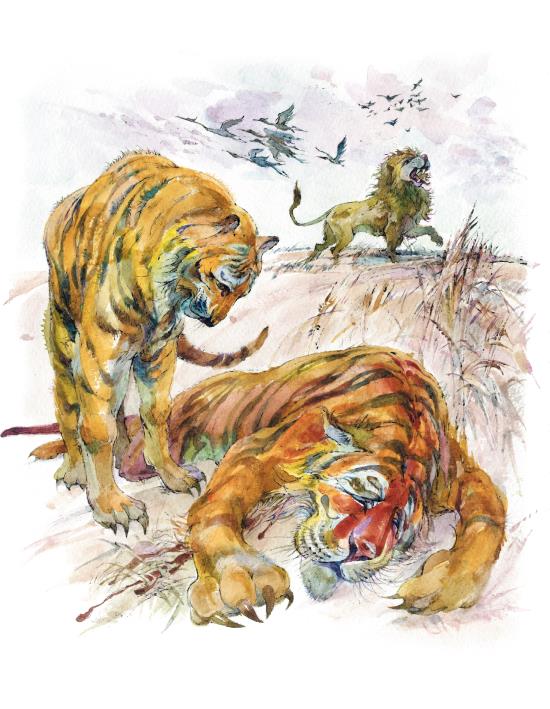 Вдруг тигр замер, забыв о бизоне. Изогнув спину дугой, он устремил жёлтые, сразу ставшие неподвижными глаза на приближавшегося огромного зверя, похожего на него, но более рослого и массивного, с широкой грудью и густой тёмной гривой.
