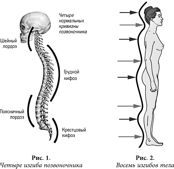 К первичным изгибам (созданным формой окружающих их костей) можно отнести изгиб черепа, грудной и крестцово-копчиковый, изгиб пятки. К вторичным изгибам, которые поддерживаются мышцами, – шейный, поясничный изгибы, изгиб коленей и свод стопы перед передней частью плюсны. Первые формируются на стадии зародышевого развития, вторые – на последних его стадиях и в течение года жизни. Хотя на самом деле они способны изменяться всю жизнь.