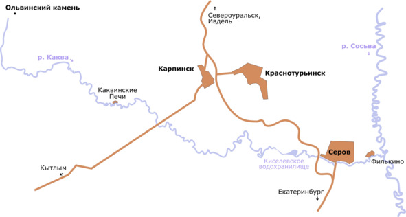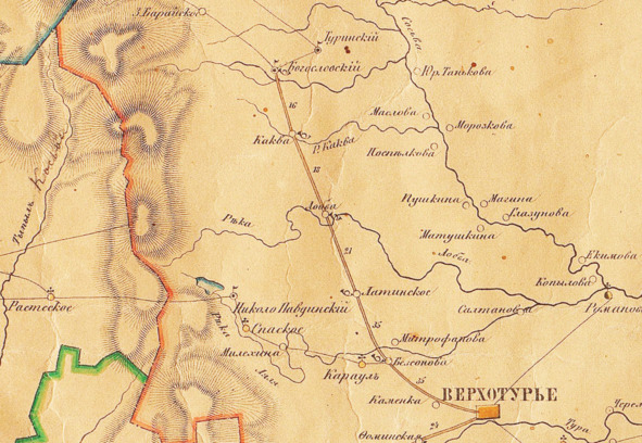 «Из г. Верхотурья есть дорога на Петропавловский завод и в Соликамск: на завод идёт оная в верх по левую сторону Туры чрез Подгородную слободу, потом чрез деревню Безсонову, р. Лялю и село Лялинское, за которым влево поворот на Соликамск, а прямая дорога к оному заводу продолжается чрез речки средню и большу Лату, зимовье Латинское, речки Кедровку, Рыбку, Лобву и зимовье Лобвинское, а при речке большой Тот сходится с дорогою из Соликамска, идущей на заводы, а после пересёкши р. Какву при зимовье Каквинском входит в Богословский завод, до которого от Верхотурья 126 вер.».