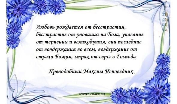 Любовь рождается от бесстрастия, бесстрастие от упования на Бога, упование от терпения и великодушие, сии последние от воздержания во всем, воздержание от страха Божия, страх от веры в Господа.