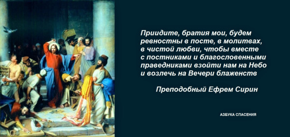 Приидите, братия мои, будем ревностны в посте, в молитвах, в чистой любви, чтобы вместе с постниками и благословенными праведниками взойти нам на небо и возлечь на Вечери блаженств.
