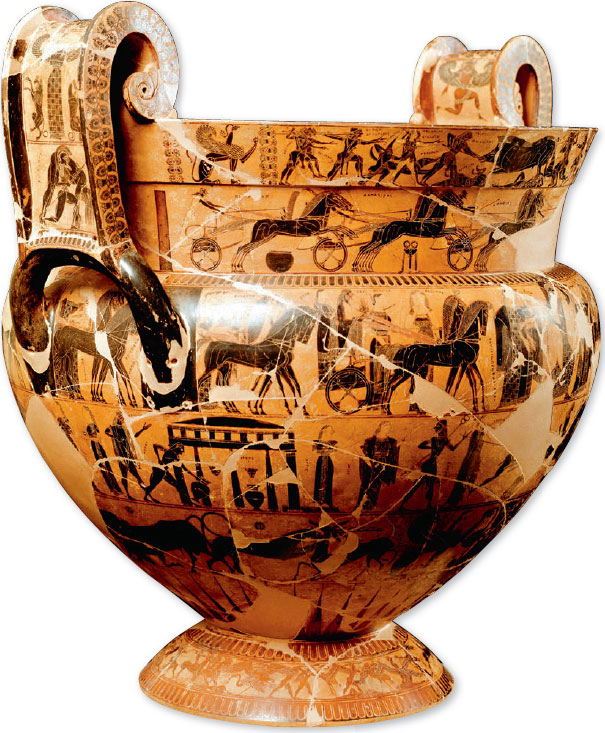 Эпоха поискаВыбором тем и своей стилистикой этот шедевр архаической эпохи свидетельствует о художественном и культурном климате, который царил в Греции, и прежде всего в Афинах, в VI в. до н. э. На рынках доминировала коринфская керамика, открытая восточным влияниям. Ваза Франсуа соперничает с коринфскими произведениями богатством орнамента, с характерным обилием звериных фигур и декоративных мотивов. Но подход к изображению гомеровских сцен исключительно афинский. Он связан с усилиями по унификации греческих мифов, предпринятыми в VI в. до н. э. афинскими правителями, особенно тираном Писистратом, при котором были впервые записаны тексты «Илиады» и «Одиссеи» в их «официальной версии». Ценности греческого мира окончательно еще не закрепились, и предпочтения в выборе мифологических тем на Вазе Франсуа отражают эту двойственность. Афины обретут свою подлинную художественную идентичность лишь в следующем столетии, с рождением краснофигурной керамики, и афинские вазы вытеснят гончарные изделия других городов.