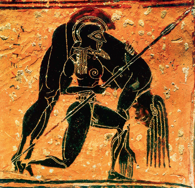 Фрагмент изображения на ручке Вазы Франсуа: Аякс несет тело мертвого Ахилла.