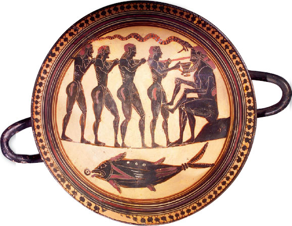 На этом чернофигурном килике изображена одна из самых драматичных сцен «Одиссеи». Запертые в пещере циклопа Полифема, который уже сожрал многих из их товарищей, греки во главе с Одиссеем придумали, как им спастись: они выкололи единственный глаз спящего гиганта обожженным колом. Вырванный из пьяного сна, обезумевший от боли Полифем становится символом грубой силы, которая отступает перед умом и хитростью цивилизованного человека.