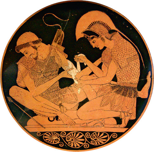 На этом краснофигурном килике V в. до н. э. изображен Ахилл, делающий перевязку своему товарищу по оружию. Такого эпизода нет в «Илиаде»; не встречается он и в других письменных источниках, за исключением одной «Олимпийской» оды Пиндара, упоминающей о том, как два героя сражались под стенами Теутрании. Поразительно согласованны в своем наклоне фигуры Патрокла, отвернувшегося, чтобы скрыть боль, и Ахилла, сосредоточенно перевязывающего левую руку друга.