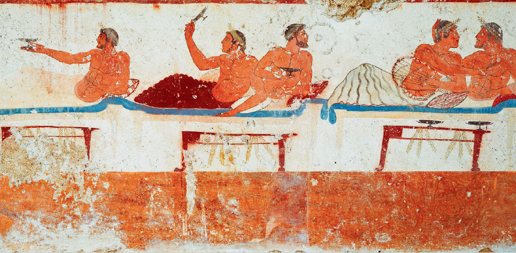 Свидетельствуя об обратном этрусском влиянии на греков периода архаики, гробница Ныряльщика в Пестуме подхватывает тему погребального пира, характерного для Тарквинии. Но разница очевидна: пары здесь составлены только из мужчин. Греки, исключая женщин из общественной жизни, предпочитали изображать союзы зрелых мужчин и юношей в пору ученичества. В этой преисполненной неги сцене беседу и возлияния сопровождают музыка и поэзия – эти два искусства нашли отражение на других стенах гробницы. Необычное использование чаш (киликов) пирующими – это игра коттаб, которая была популярна и у этрусков, и у греков: надо было метнуть невыпитые капли вина в подвешенную чашу, произнося имя любимого человека; если капли попадали в цель, это было добрым знаком для влюбленного!