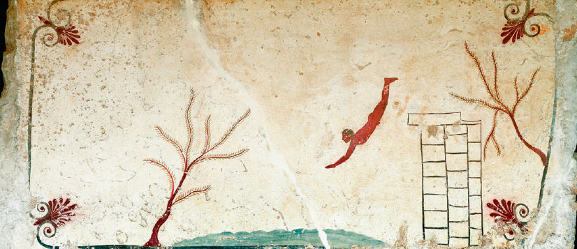 Летом 1968 г. итальянский археолог Марио Наполи, работавший на раскопках в Пестуме (античной Посейдонии), обнаружил в 2 км от основных объектов города гробницу. Она датируется началом V в. до н. э. и прославилась прежде всего необычным изображением на внутренней стороне крышки: человек, прыгающий вниз с архитектурного возвышения в воду. Не отказываясь от гипотезы, что это символ «прыжка в неизвестность», археологи допускают менее метафизическую трактовку: художник отдал должное атлетическим способностям покойного. Но ныряет он или готовится покинуть земной мир и низринуться в потусторонний, этот человек бросается в зеркало вод с решимостью, которая вызывает восхищение. В этом он близок атлетам, встречавшимся раньше в гробницах Тарквинии.