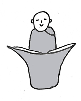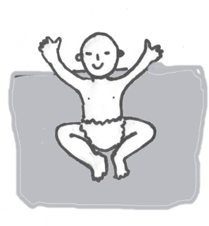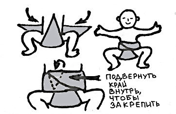Ребёнок помещается сверху так, чтобы его тело ниже поясницы находилось на марле. Нижний угол треугольника проводится между ножками и располагается на животе крохи. Правый и левый углы последовательно оборачиваются вокруг бёдер.