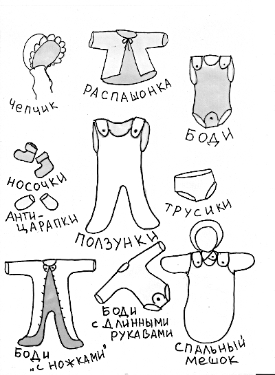 Одежда: пелёнки, чепчики, носочки, распашонки, ползунки, боди, комбинезоны.