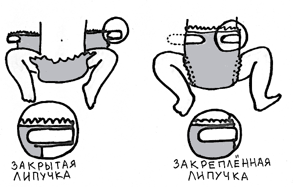 Разверните подгузник, положите его внутренним слоем вверх. Сторона спинки подгузника шире, на ней расположены закрытые липучки. Сторона животика с местом крепления липучек, на ней обычно нанесён рисунок, помогающий маме сориентироваться.