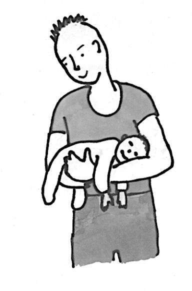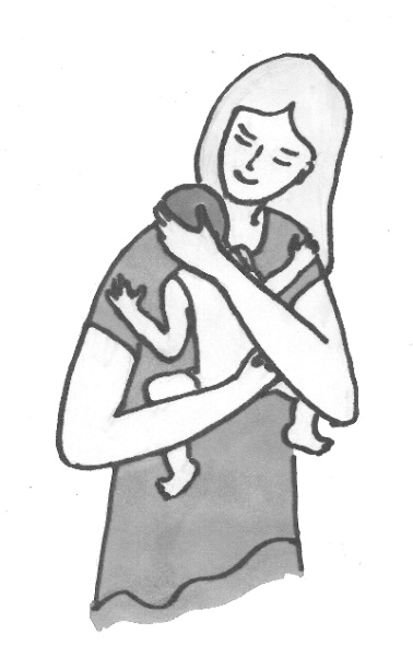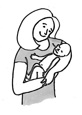 На рисунке мама правильно держит малыша, прижимая к себе, придерживая за область таза и головы. Ноги ребёнка разведены в стороны (поза лягушки), что обеспечивает правильное формирование тазобедренных суставов.
