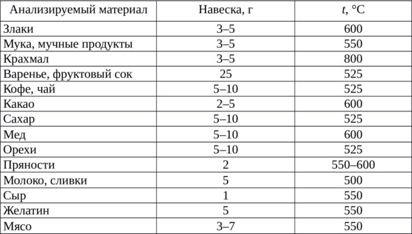 Таблица 2.5 Температура озоления некоторых материалов