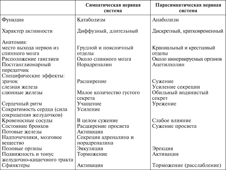Результаты активности этих двух систем во многом противоположны. Если основная функция симпатической нервной системы состоит в мобилизации организма на борьбу или бегство, то парасимпатическая нервная система преимущественно обеспечивает поддержание гомеостаза. Активация симпатической нервной системы лежит в основе поведения человека, рвущегося в бой. Возбуждение парасимпатической нервной системы обеспечивает пищеварение у человека, лежащего на диване после сытного обеда (вспомните тест Александра Македонского с горящим факелом, описанный во введении).