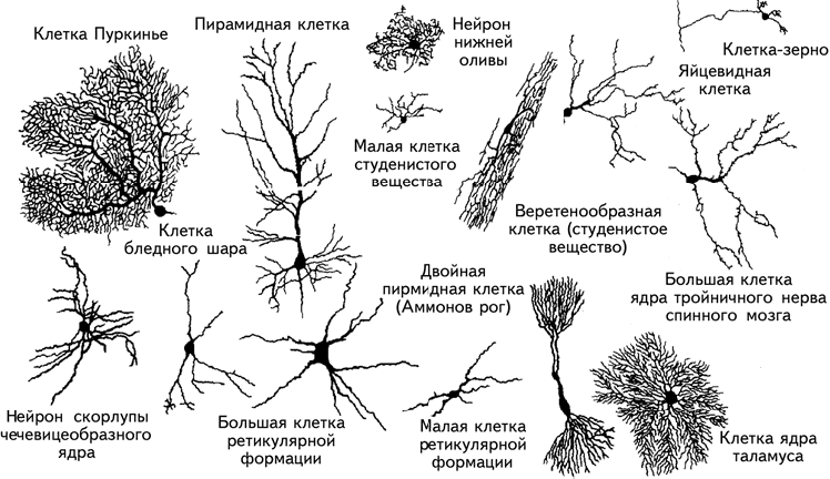 Нейроны имеют самую разнообразную форму и размер, колеблющийся от 1 до 1000 мкм (т. е. они могут различаться по величине в 1000 раз).
