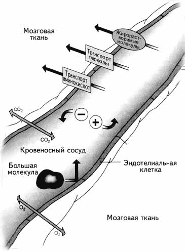 5. Астроглия формирует уникальный защитный слой между нейроном и кровеносным сосудом, так что все вещества из крови могут попасть в нейрон только через глиальную клетку. Этот барьер называется гематоэнцефалическим (haima – кровь, enkephalos – мозг, греч.). Гематоэнцефалический барьер могут преодолевать только маленькие молекулы, например ионы, глюкоза, незаменимые аминокислоты и жирные кислоты (рис. 1.13). Благодаря этому большие молекулы, токсины, вирусы и микробы не могут проникнуть в нейрон, что приводит к значительному повышению толерантности (устойчивости) мозга к вирусным инфекциям.