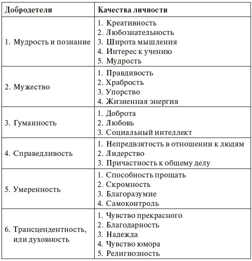 Такие же добродетели с добавлением трансцендентности были выделены в рамках позитивной психологии на основании анализа философских трудов Платона, Аристотеля, Фомы Аквинского, Августина Блаженного, а также Ветхого Завета и Талмуда, философских концепций Конфуция, Будды, Лао-цзы, Бенджамина Франклина, кодекса самураев бусидо, Корана и Упанишад. Это шесть добродетелей, общих для разных эпох, цивилизаций, культур и народов: 1) мудрость и знание; 2) мужество; 3) любовь и гуманизм; 4) справедливость; 5) умеренность; 6) трансцендентность, или духовность. Эти добродетели, выявленные на основе философских и духовно-религиозных источников, могут рассматриваться как имеющие отношение к духовным качествам личности. Добродетели и качества личности – сильные стороны характера, выделенные в рамках позитивной психологии Петерсоном и Селигманом (Peterson, Seligman, 2004), представлены в таблице 2.