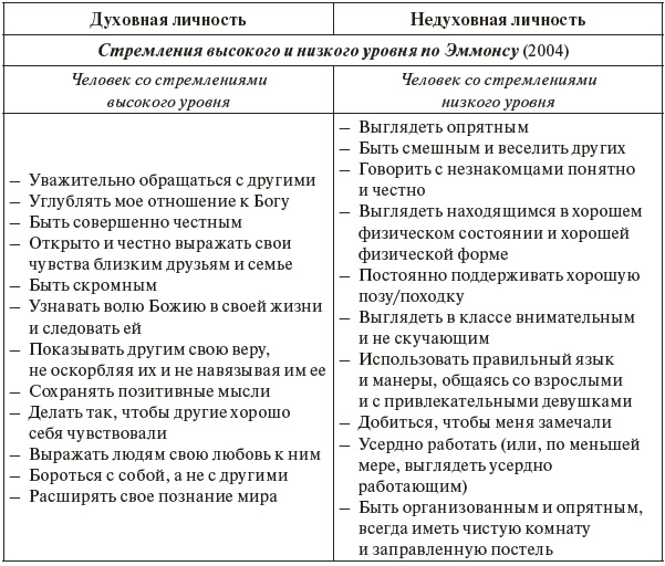 С точки зрения дихотомической классификации рассмотрим цели, характерные для людей со стремлениями высокого и низкого уровня в соотнесении с выделенными нами понятиями «духовная» и «недуховная» («бездуховная») личность (таблица 4 – Эммонс, 2004, с. 107–108). Предложенное Р. Эммонсом описание личности с помощью намерений или целей, которые человек пытается осуществить в повседневном поведении, позволяет увидеть различие «духовной» и «недуховной личности» в реальных жизненных примерах личных устремлений конкретных людей, а не в абстрактном концептуальном изложении, как было показано выше.
