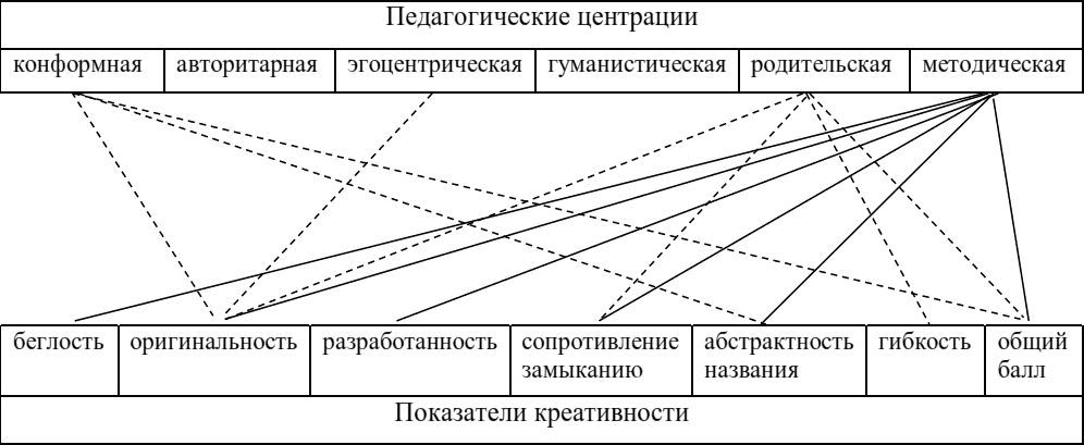 Результаты корреляционного анализа показателей креативности и педагогических центраций представлены на рисунке 1. Сплошными линиями обозначены значимые прямые корреляционные связи, пунктирными – обратные.