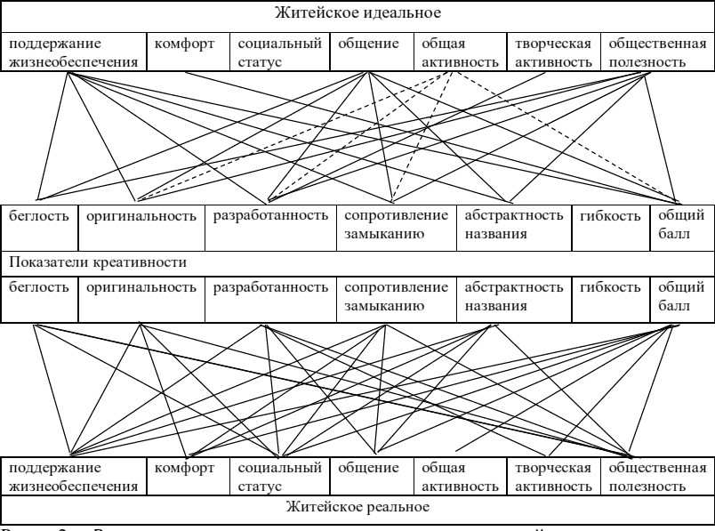 Рис. 2. Значимые корреляционные связи показателей креативности с показателями мотивационного профиля личности в житейской сфере у педагогов