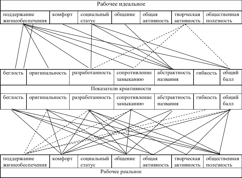 Как видим из рисунка 2, абсолютное большинство связей показателей креативности и показателей мотивационного профиля в житейской сфере положительные. С большей креативностью связаны более высокие уровни желаемого удовлетворения мотивов поддержания жизнеобеспечения, общения и общественной полезности, в меньшей степени – комфорта и творческой активности. Но и оценка реальных уровней мотивационного удовлетворения при более высоких уровнях креативности выше (и здесь картина положительных связей даже насыщенней, чем с желаемыми уровнями). Исключение составляет мотив общей активности, связи показателя его желаемого уровня с показателями креативности – отрицательные.