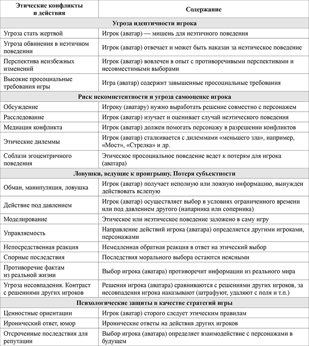 Цель исследования – составить каталог этических конфликтов и действий видеоигр, которые могут влиять на формирование и развитие моральной сензитивности, при этом создавая угрозы, риски, защиты и гарантии сохранения позитивной идентичности игрока.
