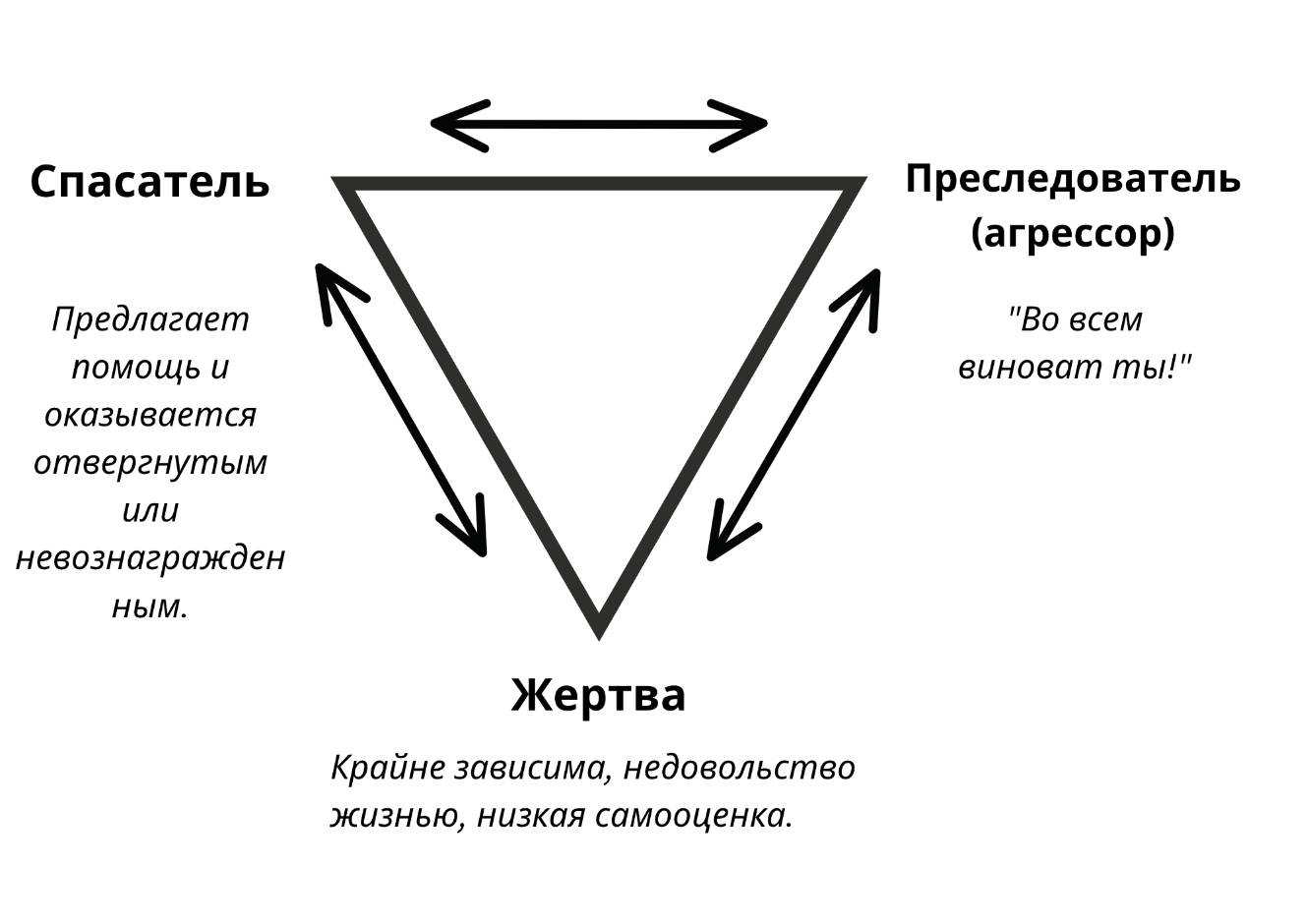 Почему так происходит? Один их партнеров, а часто оба, нецелостные личности: кто-то находится в детской позиции, кто-то – в вине или обижен на что-то или кого-то (подсказка: на себя). Это история про треугольник Карпмана, который люди часто не замечают, живя в нем и упуская все возможности своей счастливой жизни.