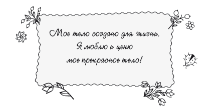 Мое тело создано для жизни. Я рада тому, что выбрала именно это тело, так как оно само совершенство для данного момента моей жизни. У меня совершенные размеры, очертания и цвет. Оно так хорошо мне служит. Я в восхищении от того, что это мое тело. Я концентрируюсь на исцеляющих мыслях, которые создают и поддерживают здоровым мое тело и позволяют мне сохранять хорошее самочувствие. Я люблю и ценю мое прекрасное тело!