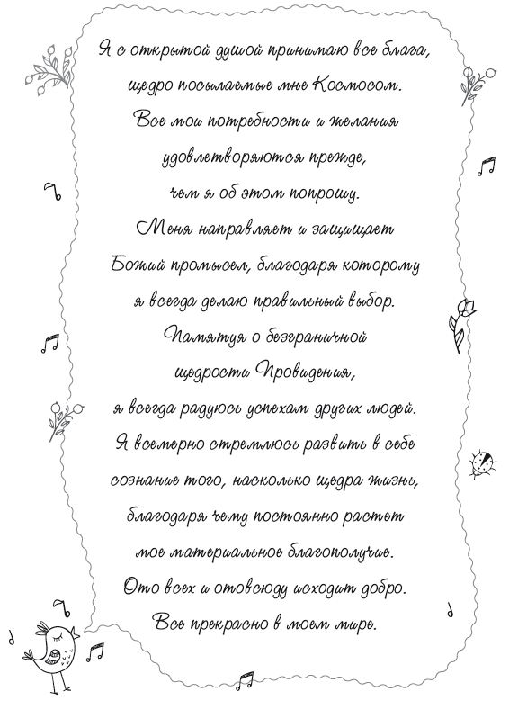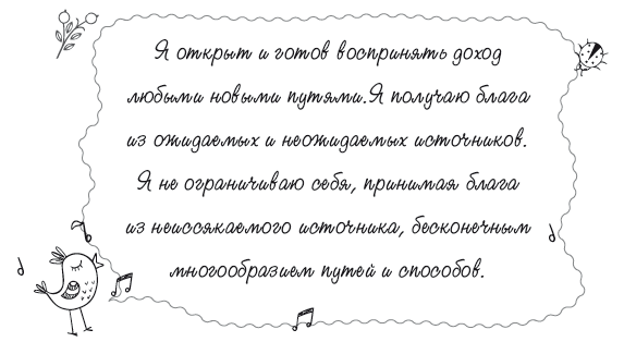 Стремясь к благосостоянию, мы обязательно достигаем того уровня, который соответствует нашим представлениям о том, чего мы заслуживаем. Расскажу вам об одной писательнице, которая хотела увеличить свой доход. Ее аффирмация гласила: «Я хорошо зарабатываю писательским трудом». Как-то она зашла в кафе, где обычно завтракала, и, удобно устроившись за столиком, вынула свои записи, приготовилась поработать. Неожиданно к ней обратился менеджер: «Вы ведь писательница? Так, может, и для меня кое-что напишете?» Он принес несколько фирменных бланков и попросил написать на каждом: «Индейка на ланч – всего 3,95 доллара». За это менеджер предложил ей бесплатный завтрак.