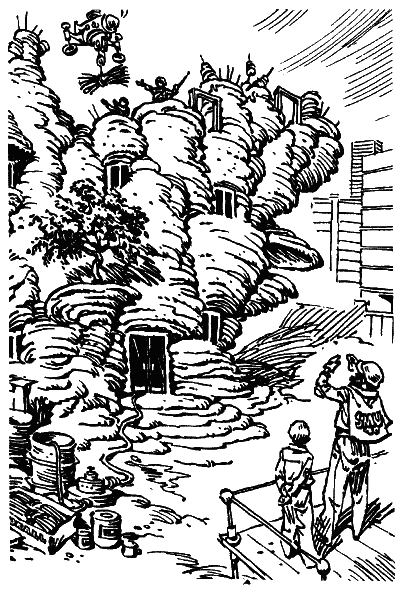 Стена постепенно заполняла промежутки между прутьями, но в тех местах, где прутья были выгнуты вперед, стена тоже выдавалась. Вениамин, рискуя упасть, наклонился и стал быстро втыкать новый ряд прутиков. И тут Коля увидел, что получается круглый балкон. Второй строитель, Лева, начал быстро отгибать прутики за спиной Вениамина, и строительное вещество послушно потекло по ним, образуя дверной проем.