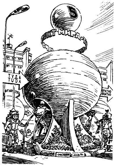 Столбики были разных цветов. На белом было написано «Мороженое», на желтом – «Лимонад», на зеленом – «Яблоки», на синем – «Бутерброды», на коричневом – «Квас». А всего столбиков было штук тридцать, и Коля не стал исследовать их до конца, чтобы не подумали, что он их раньше не видел. Мимо проходил человек, приложил палец к клавише поверх столбика, и выскочил стакан с лимонадом. Человек выпил лимонад, стакан поставил на место, и он провалился внутрь. Все ясно, сказал про себя Коля и пошел к белому столбику. Мороженое оказалось шоколадное, не очень сладкое, но есть можно. Потом Коля отошел к желтому столбику и запил мороженое лимонадом. Потом попробовал бутерброд. Бутерброд был с сыром и маслом. Такое дело надо было запить. Запил Коля бутерброд квасом и тут различил надпись на оранжевом столбике: «Бананы». Пускай будет банан. Коля съел банан, а шкурку положил на место, и она провалилась в столбик. Такая жизнь Коле нравилась, и поэтому он вернулся к мороженому. Первый раз он нажимал самую левую клавишу, теперь нажал следующую. Правильно. Мороженое было яблочное. Оно елось куда медленнее, чем первое, и, чтобы передохнуть, Коля подошел к стоянке, где люди садились в прозрачные пузыри, поглядеть, что они там делают.