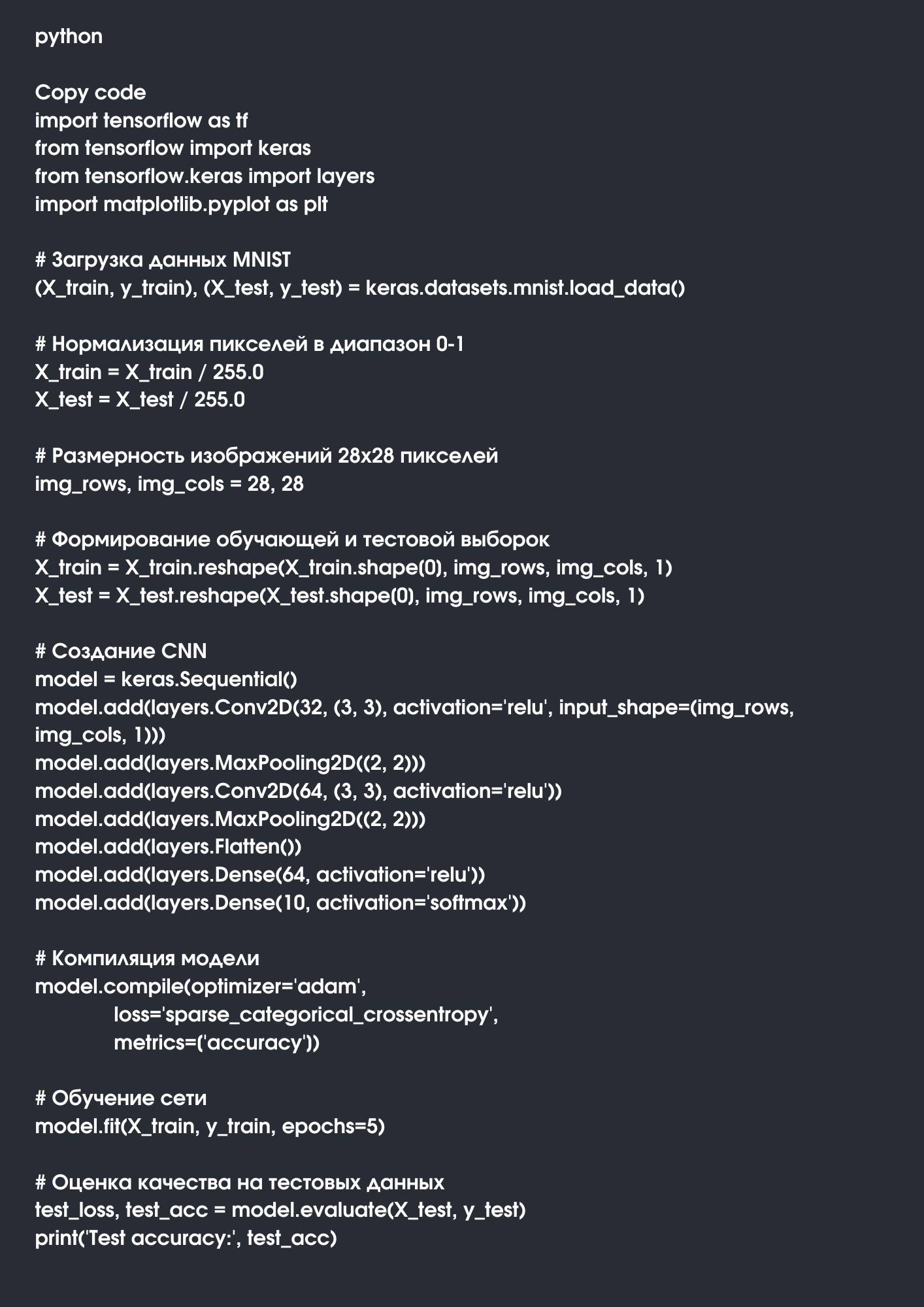 Данный пример демонстрирует загрузку данных MNIST, создание и тренировку сверточной нейронной сети в Keras на языке Python, а также оценку качества обученной модели. С помощью Python можно реализовать практически любые архитектуры нейронных сетей и алгоритмы машинного обучения для решения задач компьютерного зрения, обработки естественного языка и других приложений ИИ.