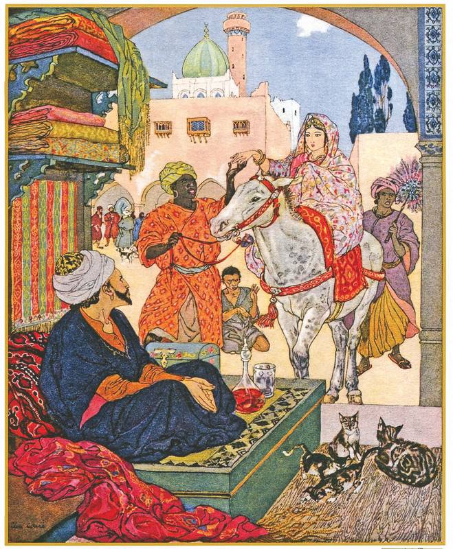 И я пришел домой, опьяненный любовью к той женщине; и мне подали ужин, и я съел кусочек – и вспомнил об ее красоте и прелести, и хотел уснуть – но сон не пришел ко мне. И я провел в таком состоянии неделю, и купцы потребовали с меня деньги, но я уговорил их подождать еще неделю; а через неделю она вдруг приехала верхом на муле, и с нею были евнух и два раба. И она приветствовала меня и сказала: «О господин мой, мы задержали плату за ткани! Приведи менялу и получи деньги». И меняла пришел, и евнух выложил деньги, и я не взял их, и разговаривал с ней, пока не открылся рынок. И тогда она сказала: «Купи мне то-то и то-то». И я взял для нее у купцов, что она пожелала, и она забрала это и ушла, не заговорив со мною о деньгах; и когда она ушла, я раскаялся в этом, так как я забрал то, что она потребовала, на тысячу динаров.
